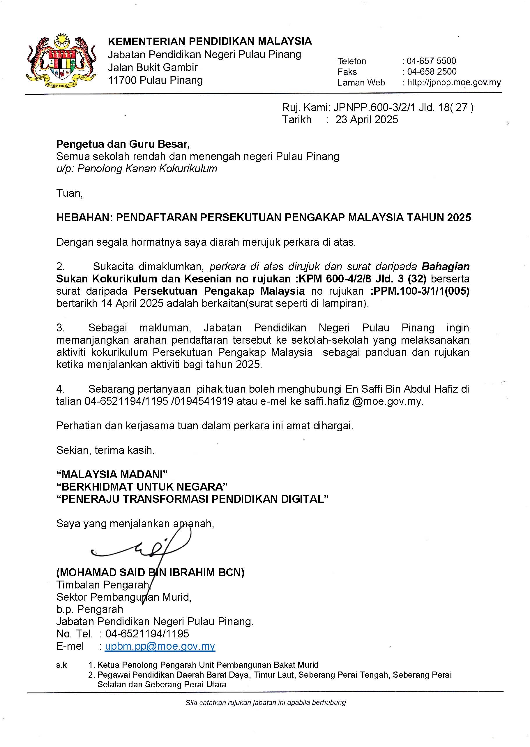 Dengan hormatnya merujuk perkara di atas, adalah dimaklumkan bahawa pihak tuan diingatkan dan diminta untuk memperbaharui pendaftaran kumpulan dan keahlian Pengakap di sekolah tuan bagi tahun 2025. Adalah menjadi satu kesalahan menjalankan aktiviti kepengakapan tanpa pendaftaran. (Akta Parlimen 1968 : Persekutuan Pengakap Malaysia).