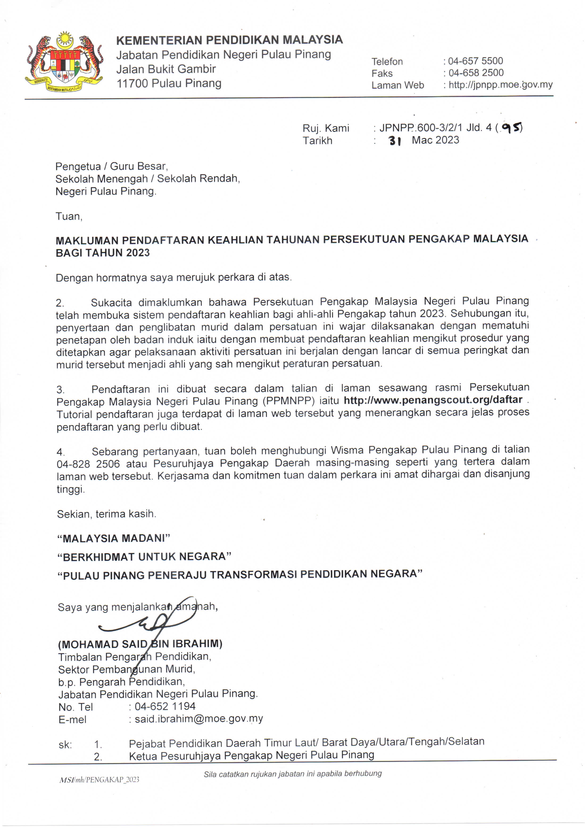 2) Adalah dimaklumkan bahawa mulai Tahun 2026, pihak Ibu Pejabat Persekutuan Pengakap Malaysia (PPM) telah menyediakan Sistem Maklumat Besepadu Pengakap (SMB) https://smbp.pengakapmalaysia.org/ bagi urusan pendaftaran Keahlian Dalam Talian.