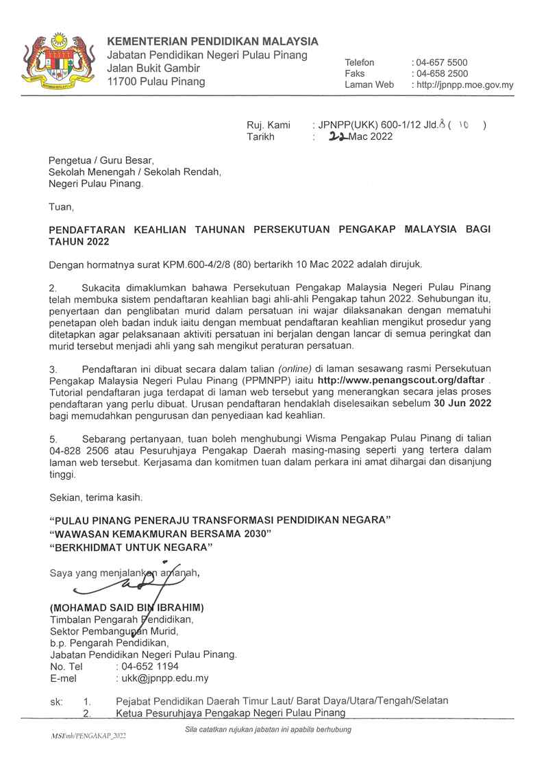 PENDAFTARAN KEAHLIAN TAHUNAN PERSEKUTUAN PENGAKAP MALAYSIA Written by Wong Kok Nian. Posted in Pengumuman dan Siaran Siaran Rasmi JPNPP: Sila ke https://daftar.penangscout.org untuk meneruskan pendaftaran. Print
