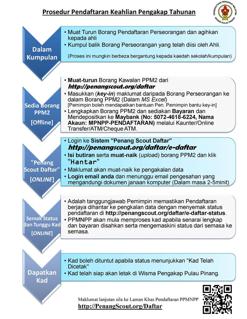 4) Bayaran Tunai tidak lagi dilayan mulai tahun 2017. Bayaran dengan cek hendaklah dibuat atas nama MAJLIS PENGAKAP NEGERI PULAU PINANG PENDAFTARAN. Sila rujuk kertas maklumat pendaftaran yang dikepilkan. Bayaran hendaklah dibuat menerusi Kaunter Maybank / ATM Maybank / ATM Cek Maybank / Maybank2U / Transaksi Online Bank Lain